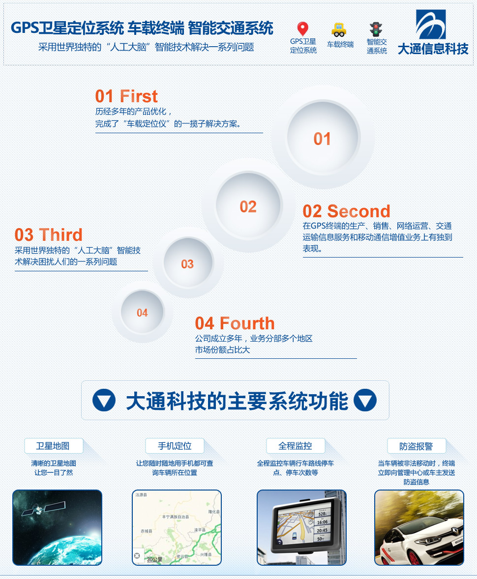 公司簡(jiǎn)介 合肥大通信息科技有限公司是一家以研發(fā)、生產(chǎn)、銷(xiāo)售、服務(wù)為一體的綜合型公司。公司注重于車(chē)輛定位系統(tǒng)的研發(fā)、信息咨詢(xún)及技術(shù)服務(wù);公司歷經(jīng)多年的產(chǎn)品優(yōu)化,完成了“車(chē)載定位儀”的一攬子解決方案。 公司以GPS衛(wèi)星定位系統(tǒng)、車(chē)載終端、智能交通系統(tǒng)為主要研發(fā)對(duì)象,并繼續(xù)促進(jìn)科研成果產(chǎn)業(yè)化,在GPS終端的生產(chǎn)、銷(xiāo)售、網(wǎng)絡(luò)運(yùn)營(yíng)、交通運(yùn)輸信息服務(wù)和移動(dòng)通信增值業(yè)務(wù)上有獨(dú)到表現(xiàn)。 公司產(chǎn)品采用“人工大腦”智能技術(shù)解決汽車(chē)調(diào)度、軌跡、里程、油耗統(tǒng)計(jì)、防盜等困擾人們的一系列問(wèn)題。 公司現(xiàn)在業(yè)務(wù)分布情況:安徽合肥、蕪湖、滁州、六安、宿州、阜陽(yáng)、黃山、池州、銅陵、安慶、馬鞍山、宣城、亳州、巢湖、蚌埠、淮南、淮北、江蘇南京、福建廈門(mén)、江西南昌、湖北武漢、四川成都等各個(gè)地方。